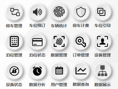 1 | 车辆设备管理系统 | 24小时智能监测停车状态、车位状态、设备状态,包括停车数据实时统计分析、车位实时监测管理、缴费管理、定时计划设备节省电能消耗、智能监测判断设备用电异常、设备异常自动报警、可远程控制设备开关、智能生成数据报表等功能。 |